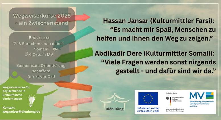 Seit mehreren Jahren organisiert Diên Hông – Gemeinsam unter einem Dach e. V. die Wegweiserkurse für Asylsuchende in Erstaufnahmeeinrichtungen in Mecklenburg-Vorpommern. Bis Juni 2025 wurden bereits 46 Kurse an sechs verschiedenen Standorten durchgeführt – ein starkes Zeichen für das anhaltende Engagement aller Beteiligten.