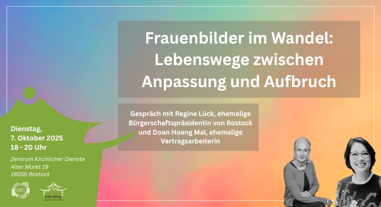 In einem Gesprächskreis möchten wir diesen und weiteren Fragen auf den Grund gehen. Dabei soll geschaut werden, was die Wende im Leben von Frauen in Deutschland verändert hat und welche Gemeinsamkeiten, aber auch welche Unterschiede die Geschichten zweier Frauen aufweisen können. Hierzu haben wir Regine Lück, ehemalige Bürgerschaftspräsidentin der Hanse- und Universitätsstadt Rostock, und Doan Hoang Mai, ehemalige Vertragsarbeiterin, eingeladen, und geben so die Gelegenheit, die Erfahrungen zweier Frauen mit ganz verschiedenen Wegen kennenzulernen. Im gemeinsamen Austausch sollen Stereotype aufgebrochen und reale Erfahrungen geteilt werden. Gemeinsam wollen wir Perspektiven sichtbar machen und das Frauenbild von damals und heute diskutieren.