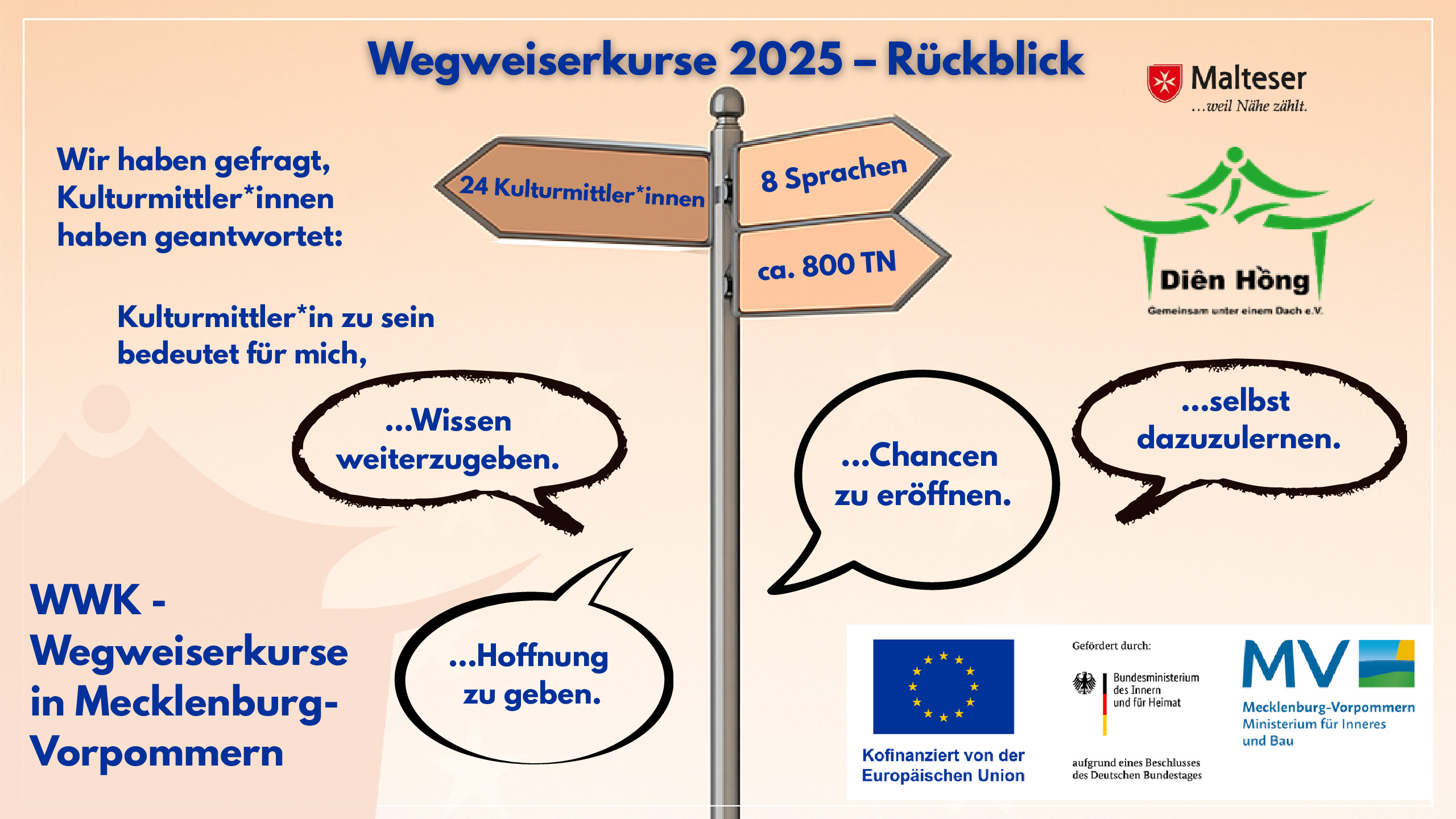 Das Projekt “WWK – Wegweiserkurse in Mecklenburg-Vorpommern” wird aus Mitteln der Europäischen Union kofinanziert und durch das Bundesministerium des Innern und für Heimat sowie Ministerium für Inneres und Bau des Landes Mecklenburg-Vorpommern gefördert.