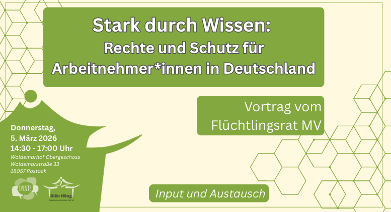 Neben dem fachlichen Input durch den Flüchtlingsrat MV gibt es ausreichend Raum für deine Fragen. Ziel ist es, Sicherheit zu schaffen, Unsicherheiten abzubauen und dich zu stärken – damit du deine Rechte kennst und selbstbewusst handeln kannst.