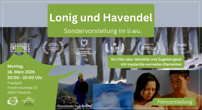Einmal im Quartal wollen wir, in Zusammenarbeit mit dem li.wu, Migrationsgeschichten und -erfahrungen sichtbar und erlebbar machen. Gemeinsam schauen wir am 16. März 2026 um 20 Uhr den Film „Lonig und Havendel“ von Claudia Tuyết Scheffel. Sie ist die Tochter einer vietnamesischen Vertragsarbeiterin und eines ostdeutschen Vaters und im Erzgebirge aufgewachsen ist. Ihr Film zeigt mysteriösen und märchenhaften Stil Fragen der Fremdheit, Identität, Zugehörigkeit und kultureller Verbundenheit auf: Um Schnee zu sehen und Deutsch zu lernen, zieht die junge Vietnamesin Trúc Lâm in einen kleinen Ort mitten im Erzgebirge. Bei einer Bergwerksführung gelangt sie in eine surreale Welt. Sie begegnet einem mysteriösen Geist, der mit der jungen Frau einen Handel abschließen möchte…