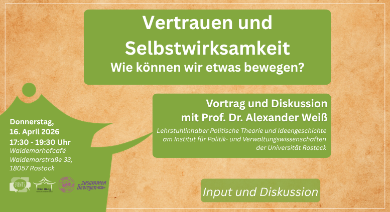 In unserer Veranstaltung wird Prof. Dr. Alexander Weiß, Lehrstuhlinhaber Politische Theorie und Ideengeschichte am Institut für Politik- und Verwaltungswissenschaften der Universität Rostock, einen Impulsvortrag halten. Im Anschluss laden wir zu einem offenen Gespräch ein, bei dem der gemeinsame Austausch, das Zuhören und unsere unterschiedlichen Perspektiven im Mittelpunkt stehen.
